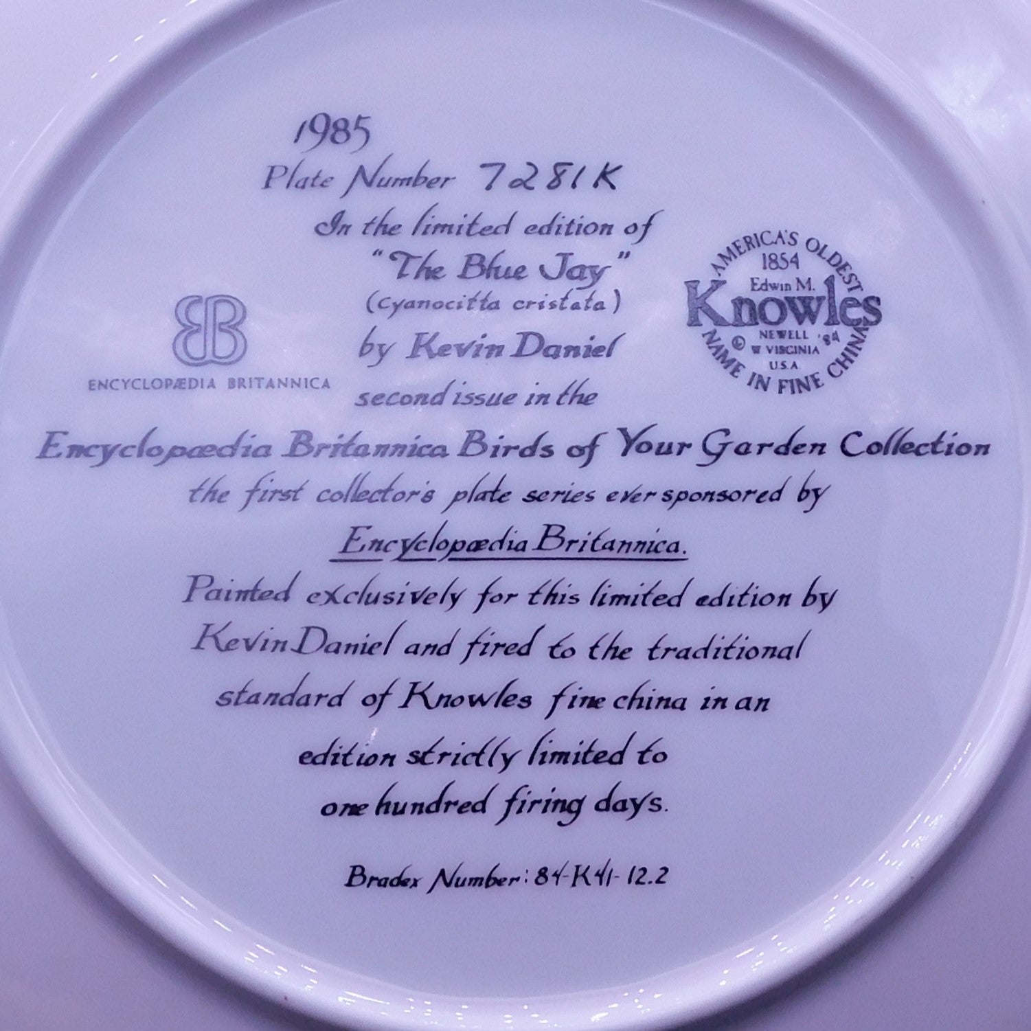Introducing a stunning vintage collectible plate titled The Blue Jay from the Encyclopedia Britannica Series by the renowned artist Kevin Daniel, proudly produced by Edwin Knowles Fine China Co. This captivating and meticulously crafted piece showcases the exquisite artistry of Kevin Daniel, depicting a vibrant blue jay in all its splendor. The plate measures 8 1/2 in diameter, making it the perfect size for display or as a statement piece. Made with the finest china, it exudes a timeless charm that is simply irresistible. Please have a look at the pictures to truly appreciate the beauty of this extraordinary vintage treasure.